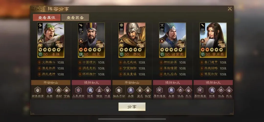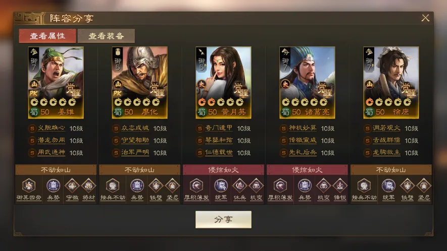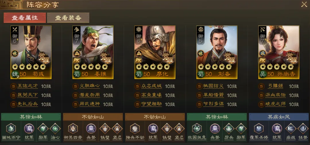 荀彧转蜀国,与刘备一起辅助姜维,廖化保护孙尚香打阵地战。荀彧的王佐之才能让姜维属性叠得更多,孙尚香负责群体断粮即可。刘备带上【节烈多谋】防止姜维被控,孙尚香即使被硬控了也能触发被动攻击,因此不用担心。