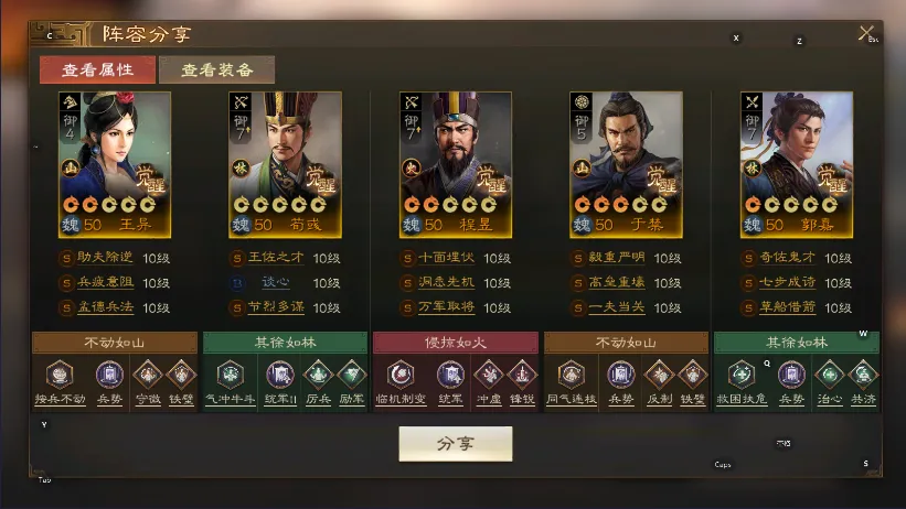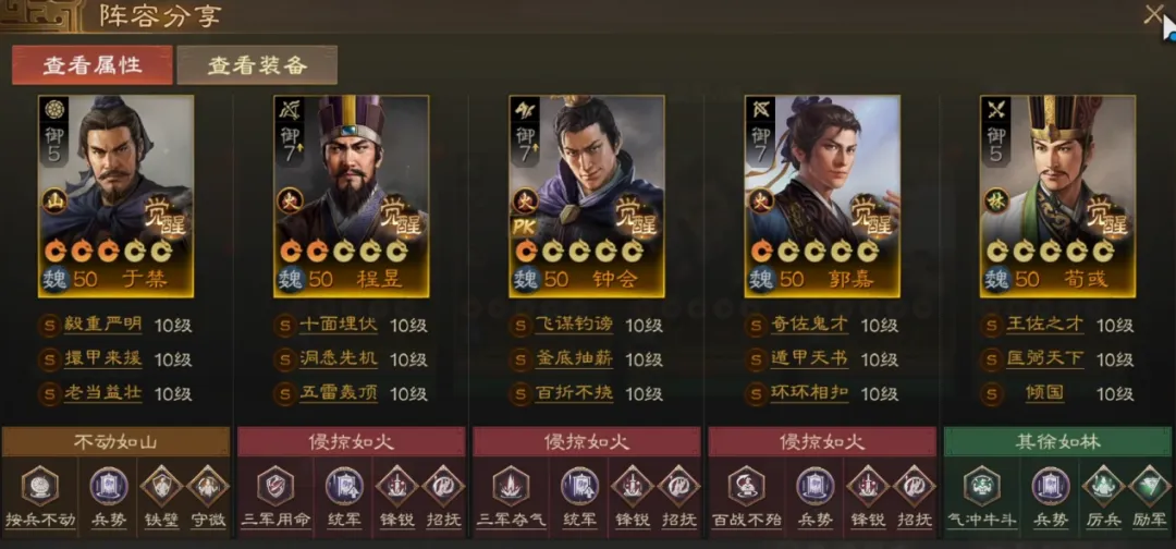 带钟会的魏智,钟会自带战法能封敌方被动,让郭嘉和程昱的输出效率更高。新战法釜底抽薪能群驱对面状态,有些情况有奇效。荀彧王佐一般给程昱,改版后的程昱输出很高。于禁带擐甲来援+老当益壮保护队友。