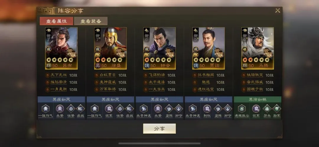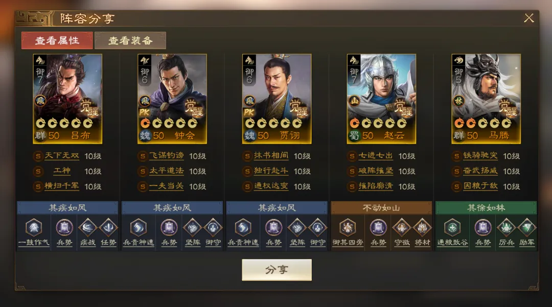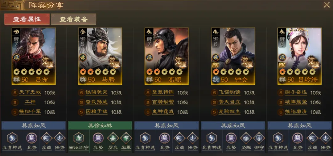 高顺+吕布+吕玲绮触发【飞将所望】羁绊,高顺转骑兵之后有不错的输出,而且身板比较硬,能扛不少伤害。高顺可以换张辽/华雄等,钟会也可以换贾诩,这里展示一下不同的组队方式供大家参考。