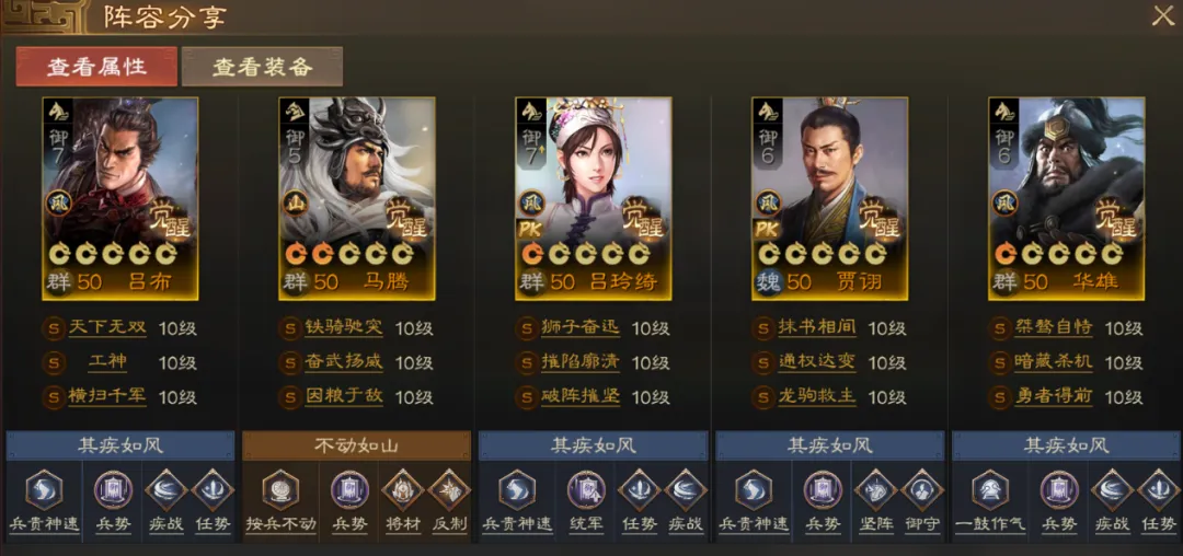 本套贾诩群骑在上个赛季已经经历过千锤百炼,因此不论是自动的效果还是连穿的强度都是非常优秀的。贾诩先手控制创造机会,吕布+吕玲琦打AOE输出,华雄最后收割。这个队伍可以触发【太师动乱】羁绊,提高主力输出伤害。