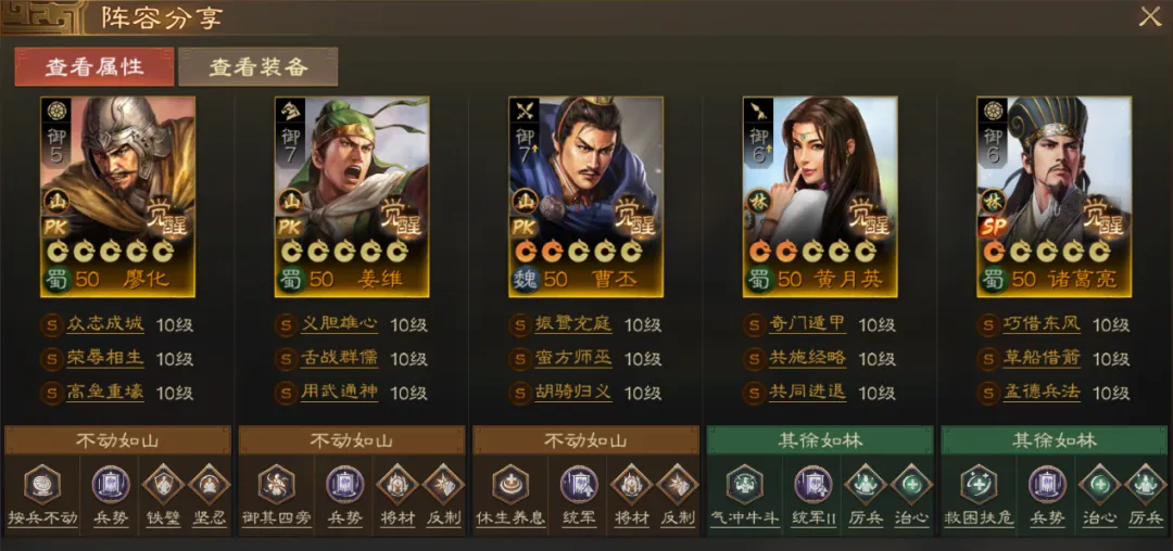 北伐罚站流,老阵容依然强势,诸葛与徐庶连环控制让对方罚站,神机妙算+洞若观火+传檄宣威的连招,能有效打乱敌人的进攻节奏。前三回合出伤速度较慢,等姜维属性叠起来就能收割。