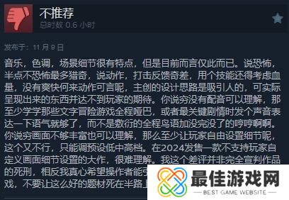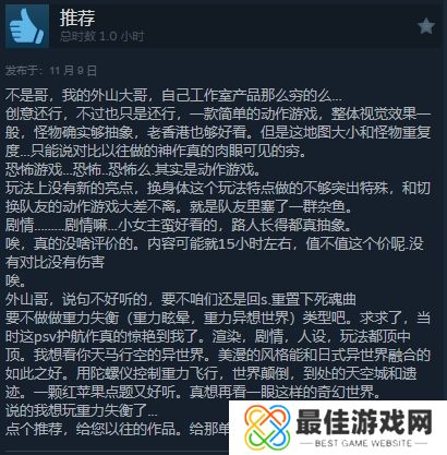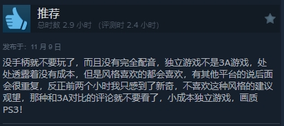 Steam的评价一直与媒体的评分不太相同,毕竟是玩家体验过才发的评论,媒体则可能没有绝对的公正。《野狗子》在Steam上“特别好评”,大部分玩家都在夸赞创作人的灵感、新点子、游戏玩法设计等创意内容,只有几个打出差评,表示“这部游戏质量太差了!”“场景效果好,但是弹反手感不好。”等意见。