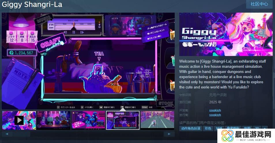 今日(11月9日),五线谱动作×经营模拟游戏《Giggy Shangri-La》Steam页面开放,2025年发售,游戏暂不支持中文。 游戏介绍: 畅快的五线谱动作×现场酒吧经营模拟,欢迎来到【吉吉