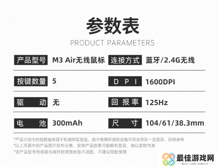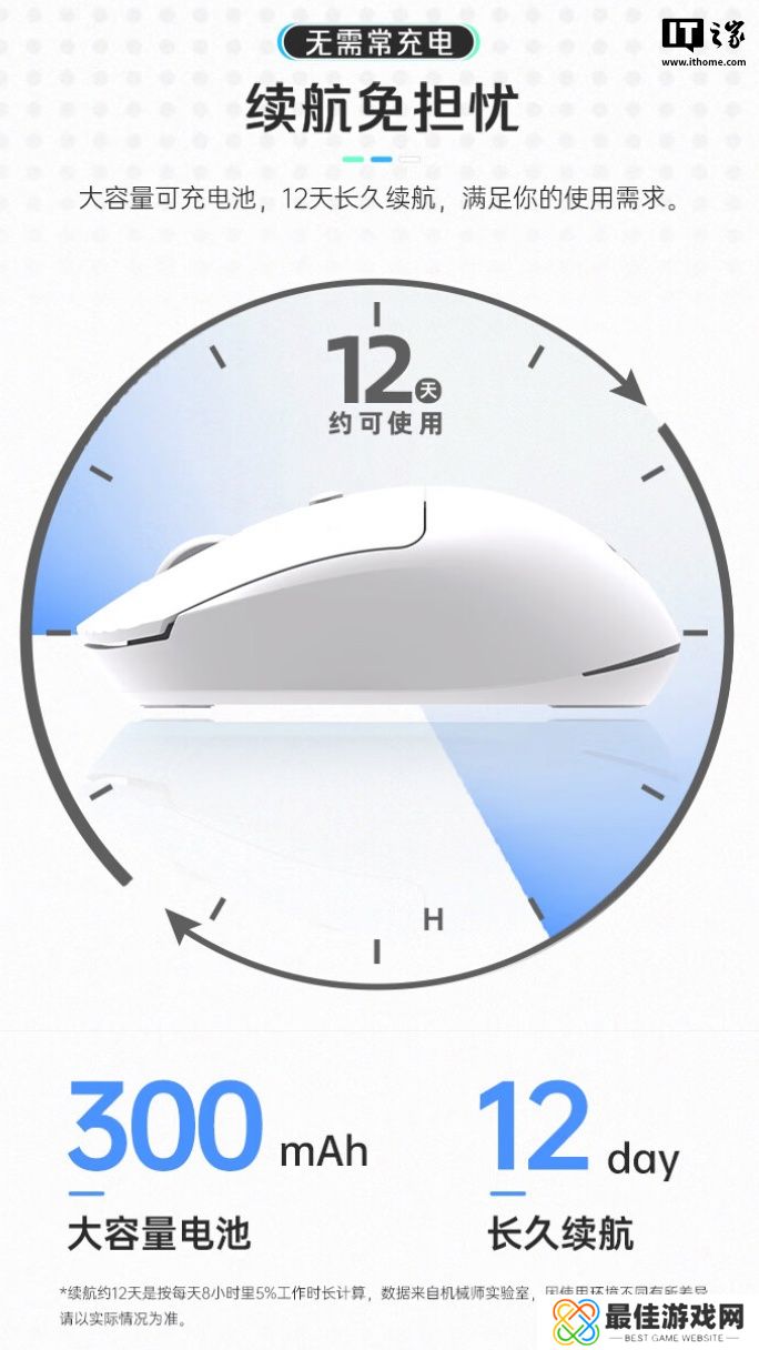 规格方面,该鼠标至高拥有1600DPI,回报率 125Hz,内置300毫安时电池,续航约12 天。