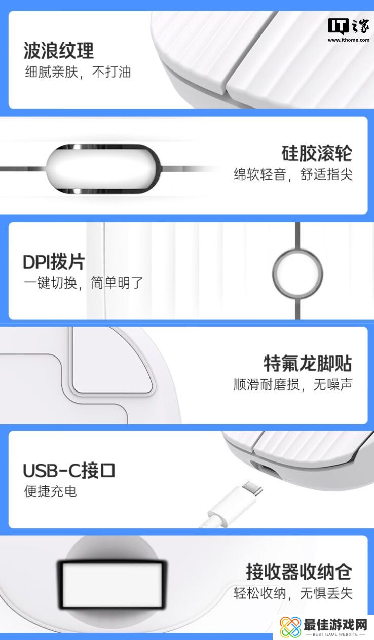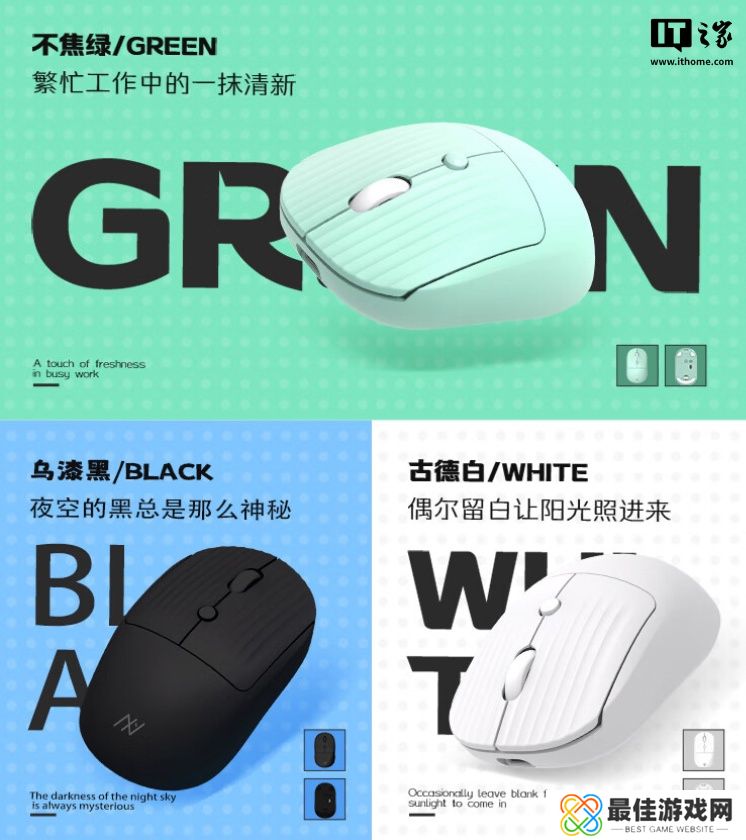 据介绍,这款鼠标可选“不焦绿”、“乌漆黑”、“古德白”三种配色,配有轻音按键,双键上拥有波浪纹理,整体重量65克。
