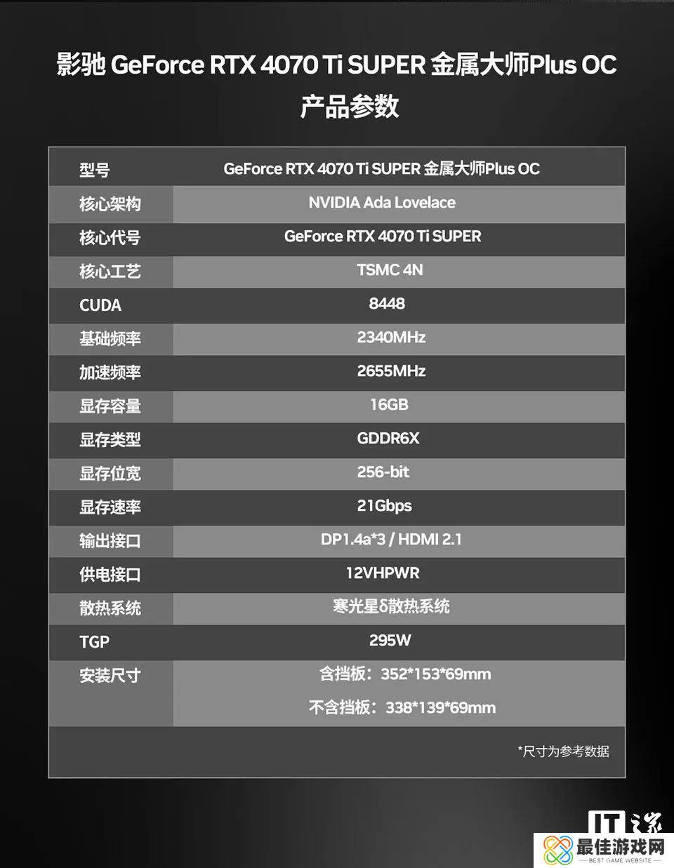 影驰 RTX 4070 Ti SUPER 金属大师 Plus OC 配备 AD102-175 核心和 16GB GDDR6X 显存,GPU 加速频率 2655MHz,TGP(图形系统整体功耗)达 295W。