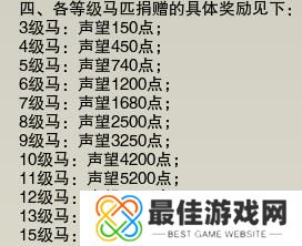 1、玩家可通过上缴任意马匹把声望提升到【友好】,之后则需要提供对应等级的马匹才能加声望;