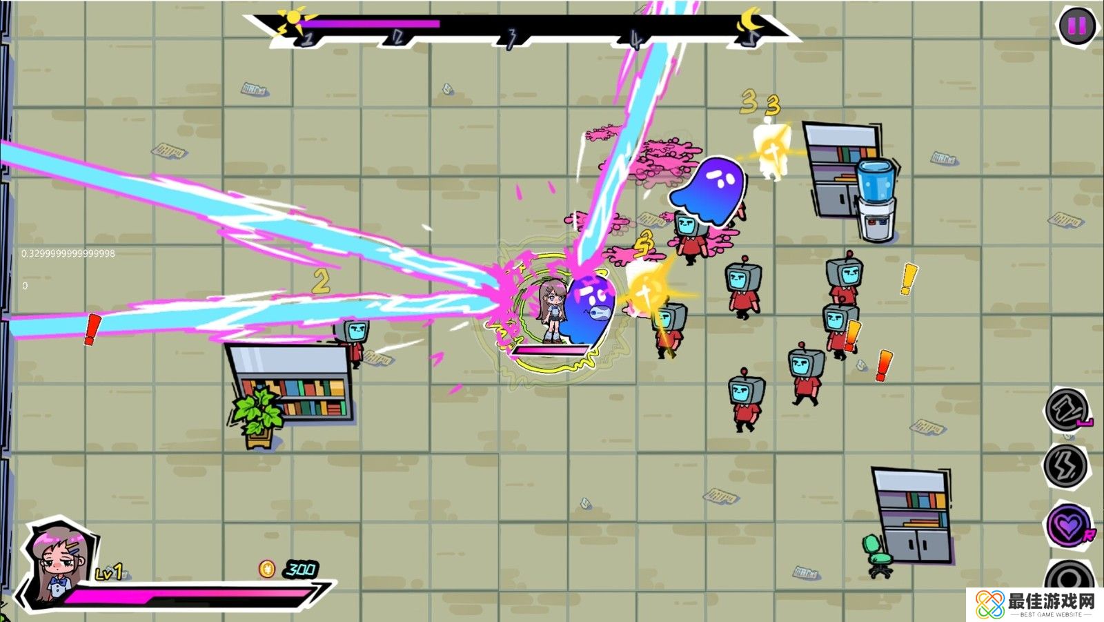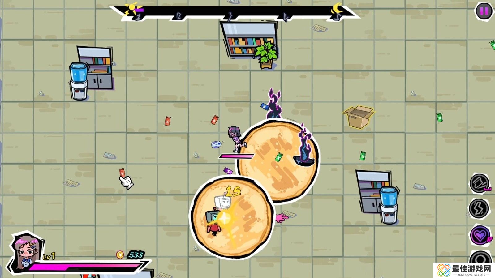 你在工作中最经常用到的东西是什么?鼠标、键盘还是喝水的水杯之类的,在这里,它们就是你最称手的武器,游戏中提供十几种不同的初始武器,而随着游戏的推进,你可以对它们进行各种改造,以大幅强化它们的能力,甚至展现出完全不同的形态和功能,每种武器都有不同的进化分支,也许能将键盘改造成什么奇奇怪怪的东西也说不定……?