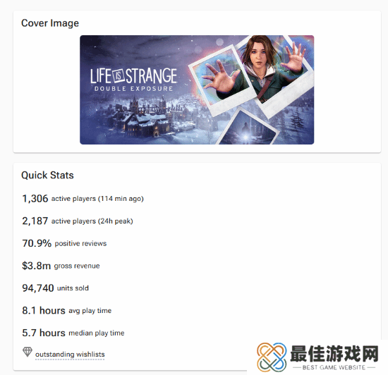 据知名国外数据分析机构VG Insights的最新统计,截至本文发布之时,《奇异人生:双重曝光》在Steam平台上已成功售出94,740份,实现了约380万美元(折合人民币约2699万元)的销售额,玩家的平均游戏时间达到了8.1小时。
