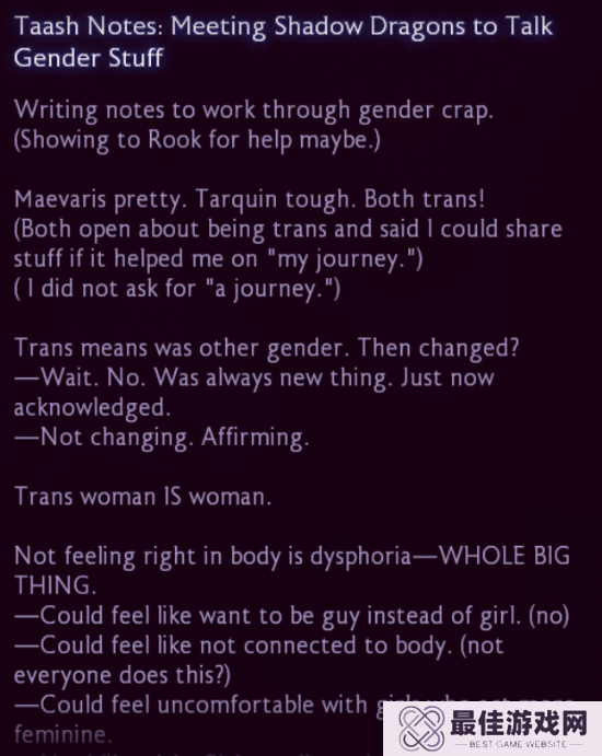 《龙腾世纪4:影障守护者》已正式面世,近日,推特上的博主@laureanojgv在游戏中发现了Taash角色的笔记,其内容充斥着关于“性别认同”的争议性言论,迅速在网络上引起了广泛讨论。 笔记中