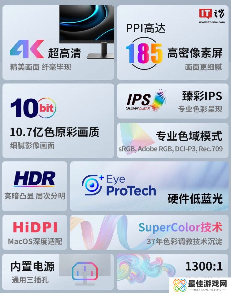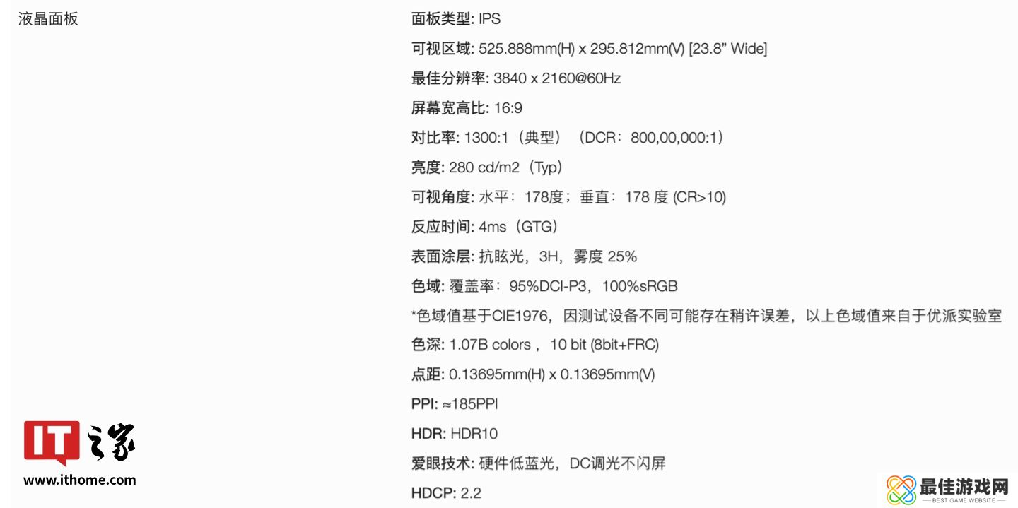 据介绍,该机配备3840x2160分辨率60Hz IPS面板,亮度 280尼特,响应速度4ms,静态对比度1300:1,支持10-Bit 色彩(8-Bit + FRC),覆盖95% DCI-P3及100% sRGB色域。