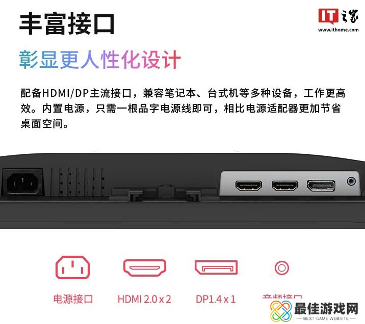 该机显示器支架支持倾斜,显示器本体支持VESA 100x100mm壁挂,提供2个HDMI 2.0接口、1个DP 1.4接口、1个 3.5mm接口,该机没有配备 USB-C 接口。