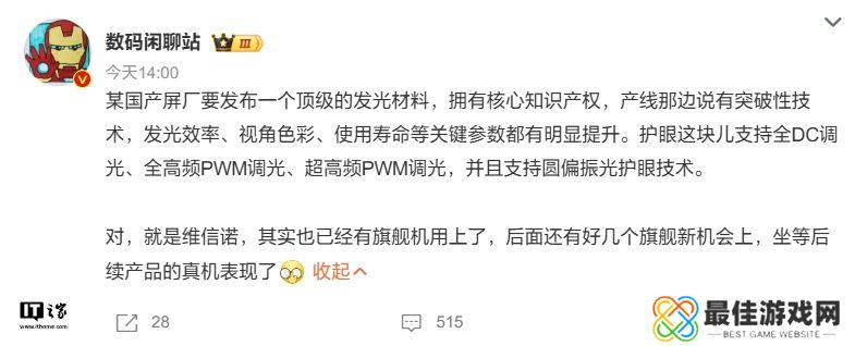 而在今天下午,博主 @数码闲聊站 发文透露,维信诺要发布一个拥有知识产权的“顶级发光材料”,产线称有“突破性技术”,在发光效率、视角色彩、使用寿命等关键参数上都有明显提升。护眼方面,其支持全 DC 调光、全高频 PWM 调光、超高频 PWM 调光,并且支持圆偏振光护眼技术。