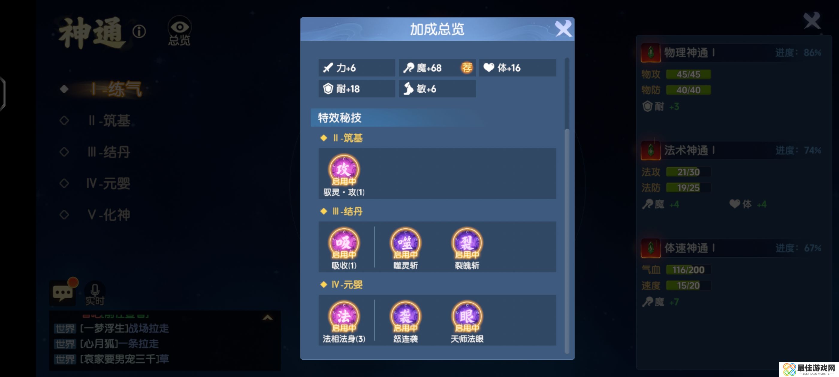 6、神通系统目前有五个阶段,其中每个阶段分为物理神通,法术神通,体速神通。如下图。要注意的是练气期只有属性加成。筑基期开始就有了特效。结丹期才开始有特技。