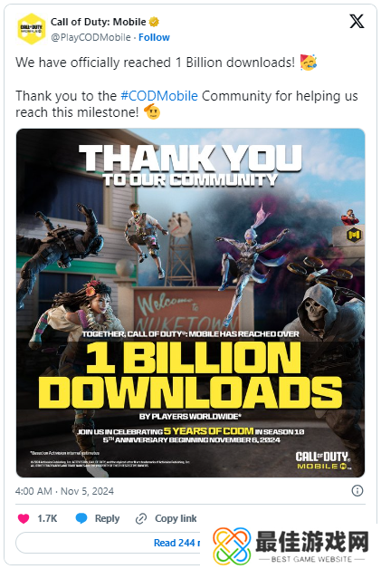 动视暴雪昨天在“X”上宣布,自2019年10月发布以来,手游《使命召唤:Mobile》的下载量已超过10亿次!无论用何种标准衡量,这都是一个令人印象深刻的数字。《使命召唤》系列游戏一直是动视暴雪的畅销产品,因此其持续的成功并不令人感到很意外。