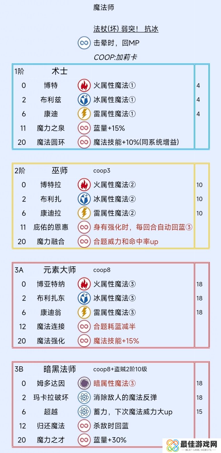 等级1 魔法师的原型 队伍可研习“术士”。 等级2 支持者的声音 即使相距很远,也可以感应到支持者的声音。 魔法师的风范 可以减少研习“魔法师”系统阿基态所需的MAG。 等级3 魔法师的原型·高阶 队伍可研习“巫师”。 分析敌情 可通过指令战斗详细地分析敌人的情报。 等级4 继承的艺术 “魔法师”系统的技能继承格增加至2格。 援军的气息 在迷宫中使用妖精眼时,会显示详细信息。 等级5 胜利的呼吸 进入指令战斗时,有低概率会增加追击图标。 魔法师的品格 可以大幅减少研习“魔法师”系统阿基态所需的MAG。 等级6 继承的真谛 “魔法师”系统的技能继承格增加至3格。 等级7 继承的精髓 “魔法师”系统的技能继承格增加至4格。 等级8 魔法师的原型·最高阶 队伍可研习“元素大师”和“暗黑法师”。 胜利的决心 在指令战斗中,有一定概率会增加追击图标。