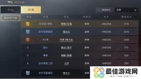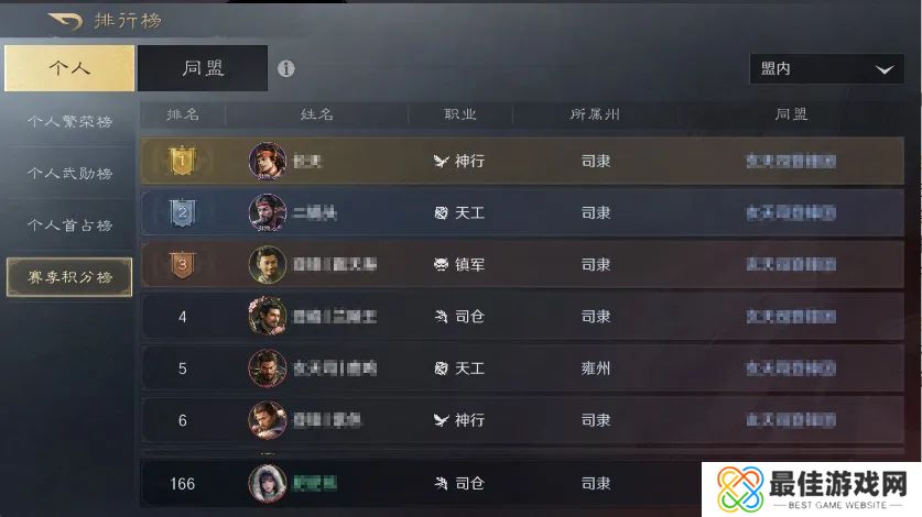 然后再以自己在盟内的个人赛季积分排名来判断个人是否能获得霸业资格。当我们点开排行榜就可以查看到自己的赛季积分排名,分为盟内排名和全服排名,此时关注盟内排名即可。