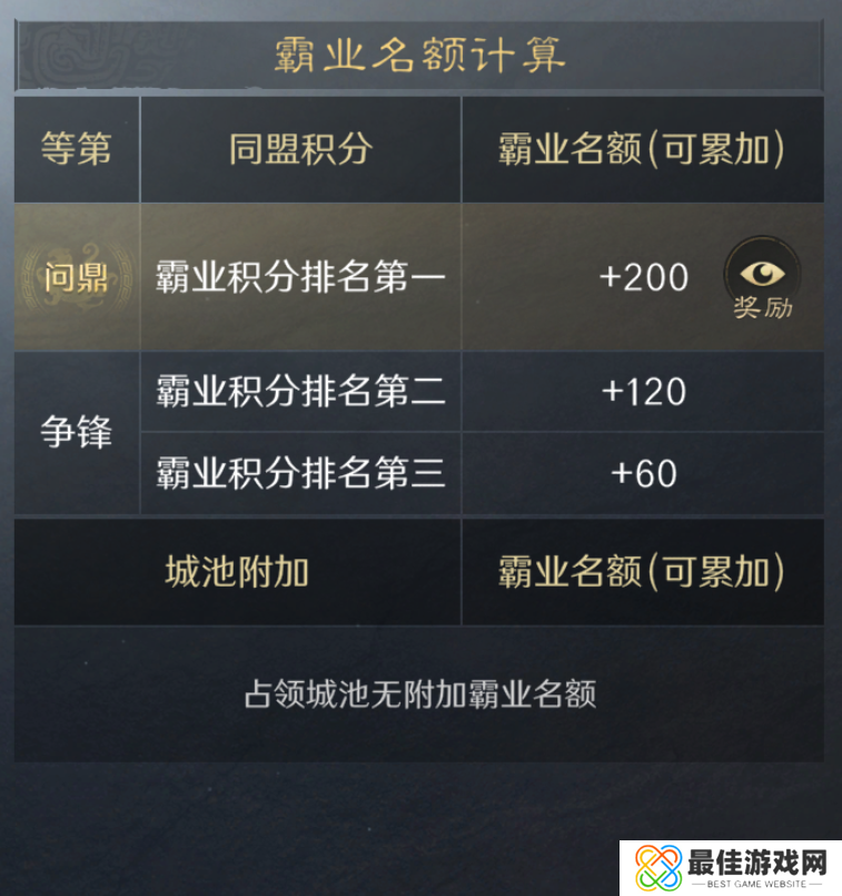 其次,盟内赛季积分排名决定了个人最终是否获得霸业。若个人的盟内赛季积分榜排名在同盟最终获得的霸业名额数量内,即结算为获得霸业名额;反之则结算为获得逐鹿奖励(未获得霸业名额的玩家结算类型均为逐鹿,霸业和逐鹿对应不同的结算奖励)。