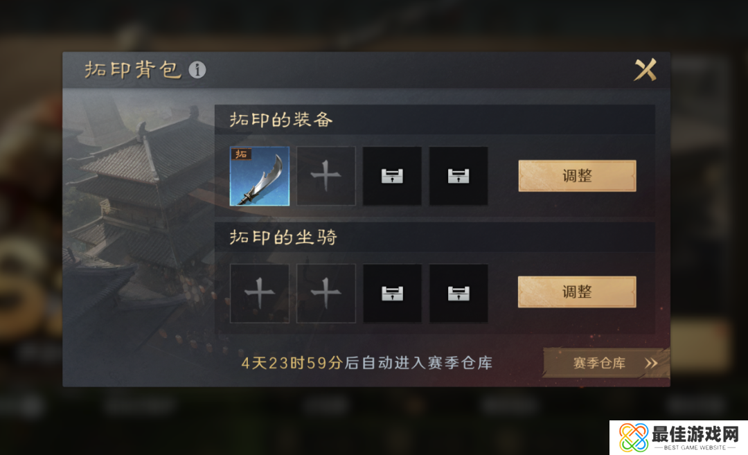 赛季结算后会开启拓印背包功能,可将本赛季获得的装备和坐骑放入拓印背包,每赛季可放入的初始数量均为2(可通过云游四海活动最多增加至各4个),未放入拓印背包的装备和坐骑将在赛季结束后消失;新赛季开始前装备和坐骑进入赛季仓库,创角后48小时内可从赛季仓库取出装备和坐骑最多各4件,取出后不可进行养成,赛季结束后消失。