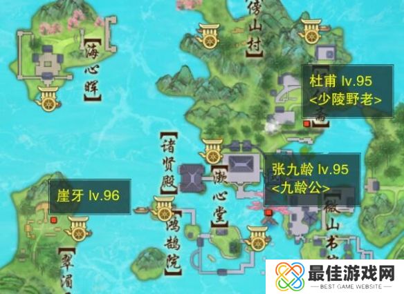 2、然后去图示的位置找【崖牙、 张九龄、杜甫、王维】获得四份调查笔记;
