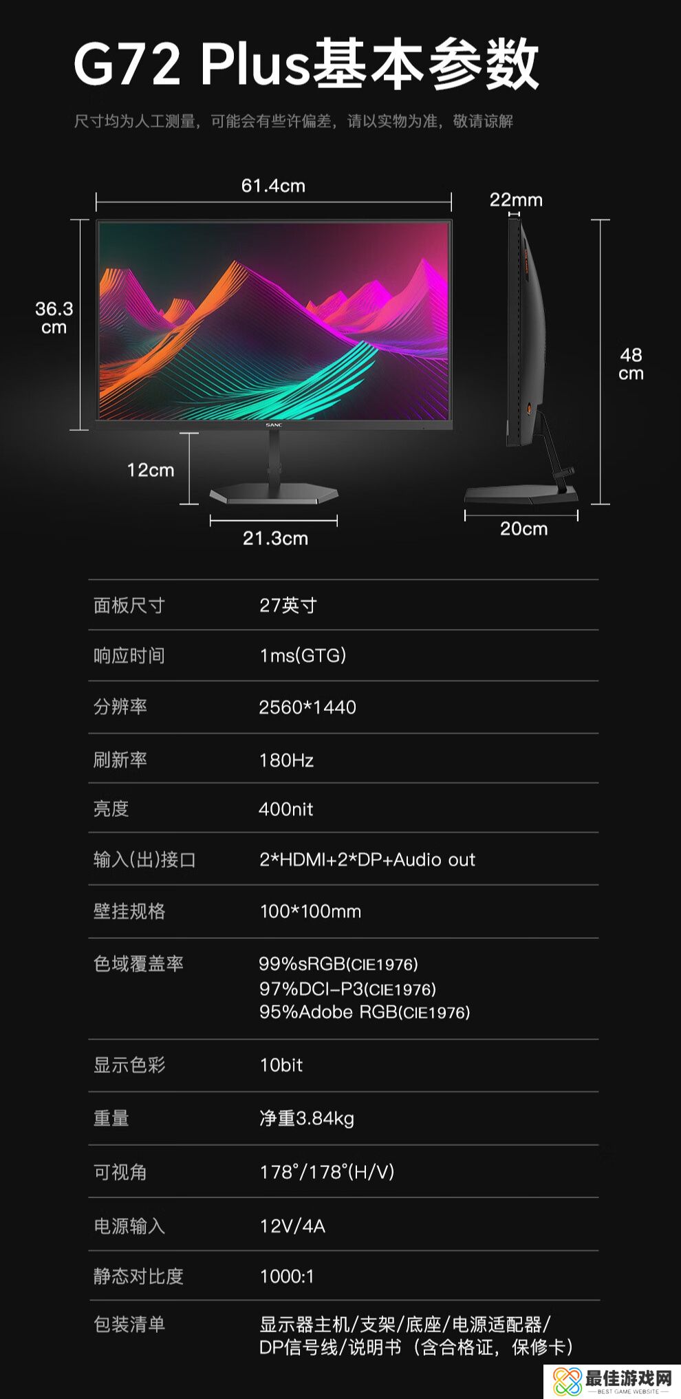 盛色 G72 Plus 27 英寸显示器亮点、参数信息如下: