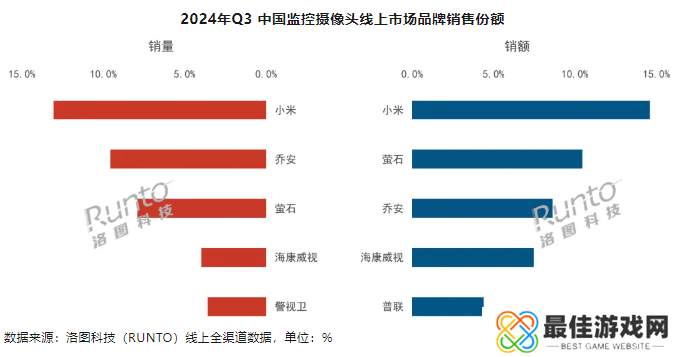 根据洛图科技线上全渠道数据,2024 年第三季度,小米、萤石、乔安、海康威视在线上市场的销量、销额维度下稳居前四,销量合计份额(CR4)为 36.7%。