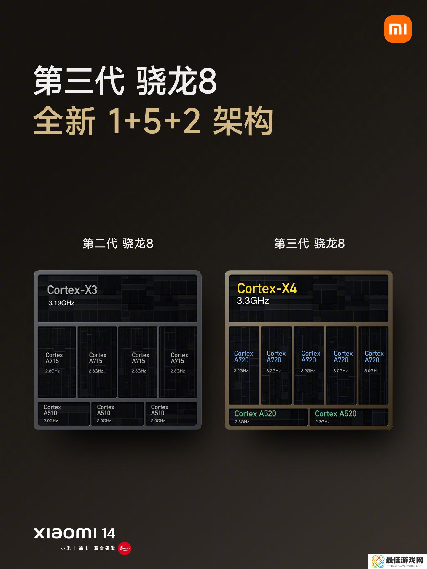 小米 14 搭载高通骁龙 8 Gen 3 处理器,采用全新 1+5+2 架构,包括 1× 3.3GHz Cortex-X4 + 3× 3.15GHz Cortex-A720 + 2× 2.96GHz Cortex-A720 + 2× 2.27GHz Cortex-A520。