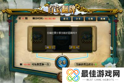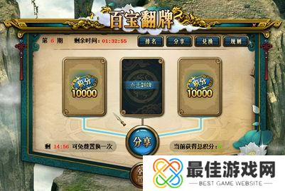 此外,玩家还可以在分享页面获取他人分享的两张相同图案。当玩家的翻牌状态处于A+A+B的状态下,就可以进行分享操作,分享后将额外获得积分奖励。每位玩家每日最多可分享20次,每日最多可获得200点积分,这些积分可用于兑换超级神兽丹、道具套餐卡、超级绿水晶等多种实用道具。在百宝翻牌的过程中,还有概率翻出幸运的万能图片,它能够代替任意的置换图片。
