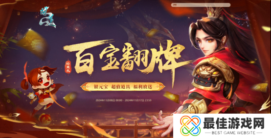 活动期间,可以在游戏界面右上角点击“百宝翻牌”按钮参与活动。通过将三张图片凑成同一图案,便有机会赢得元宝、道具、积分等多种奖励。