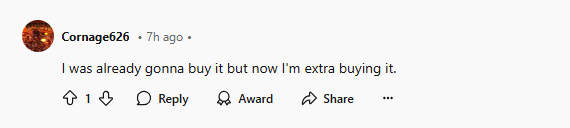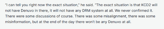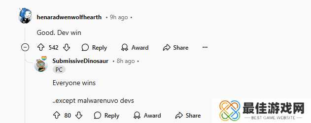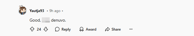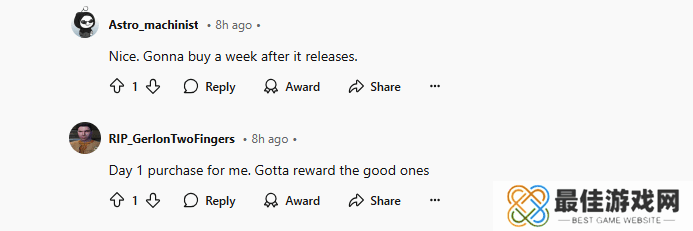 有玩家将消息分享到Reddit论坛后,随即引发玩家热议,玩家们纷纷支持Warhorse Studios的这一举动,说道:“太好了,没有D加密,(游戏的)性能问题就少了,首发必买。”还有玩家锐评道:“终于有开发商选择了品质,而不是贪婪。”