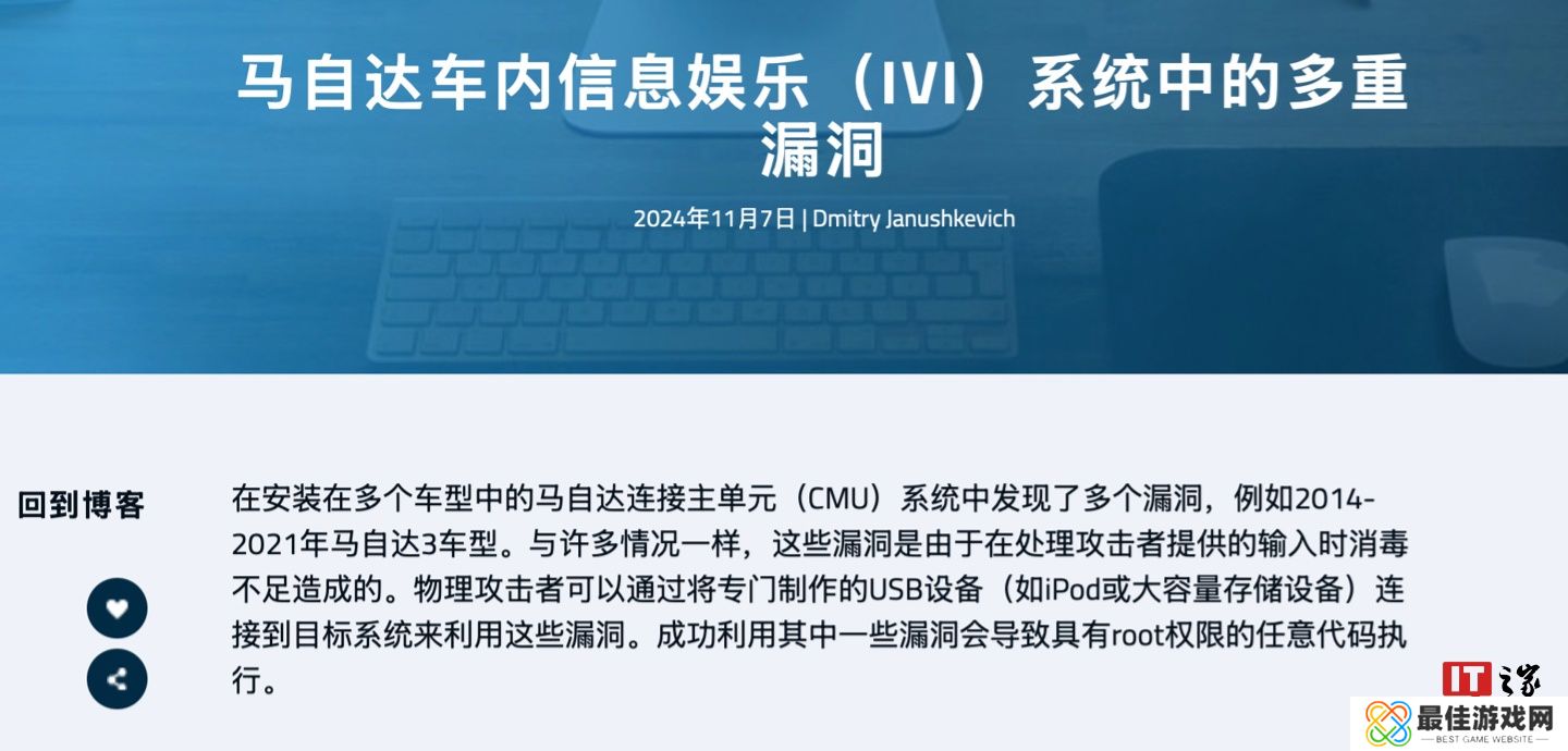 本站 11 月 10 日消息,安全公司趋势科技近日发现日本汽车制造商马自达旗下多款车型的CMU车机系统(Connect Connectivity Master Unit)存在多项高危漏洞,可能导致黑客