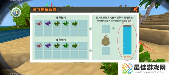 3、接着点击样子提炼装备,放在燃料和氧气材料,等右侧进度为300时。
