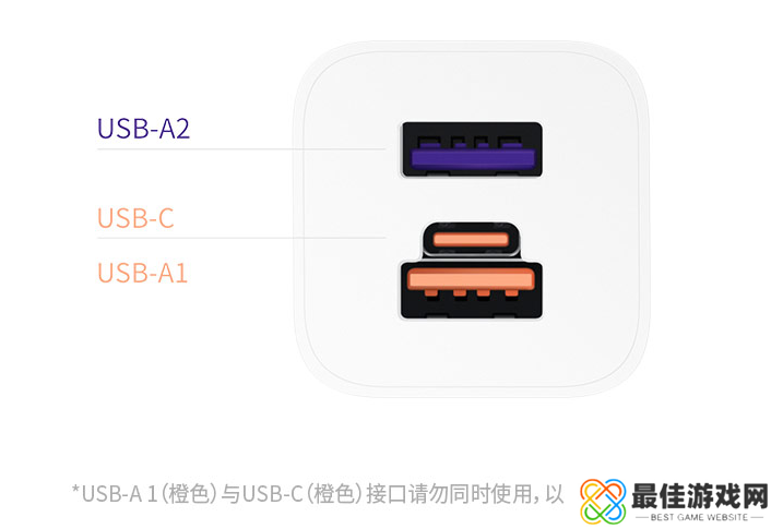 该充电器具备两个 USB-A 型接口,一个 Type-C 接口,两个橙色的接口紧挨在一起,目的是为了避免同时使用。