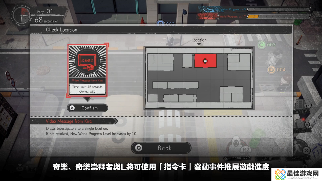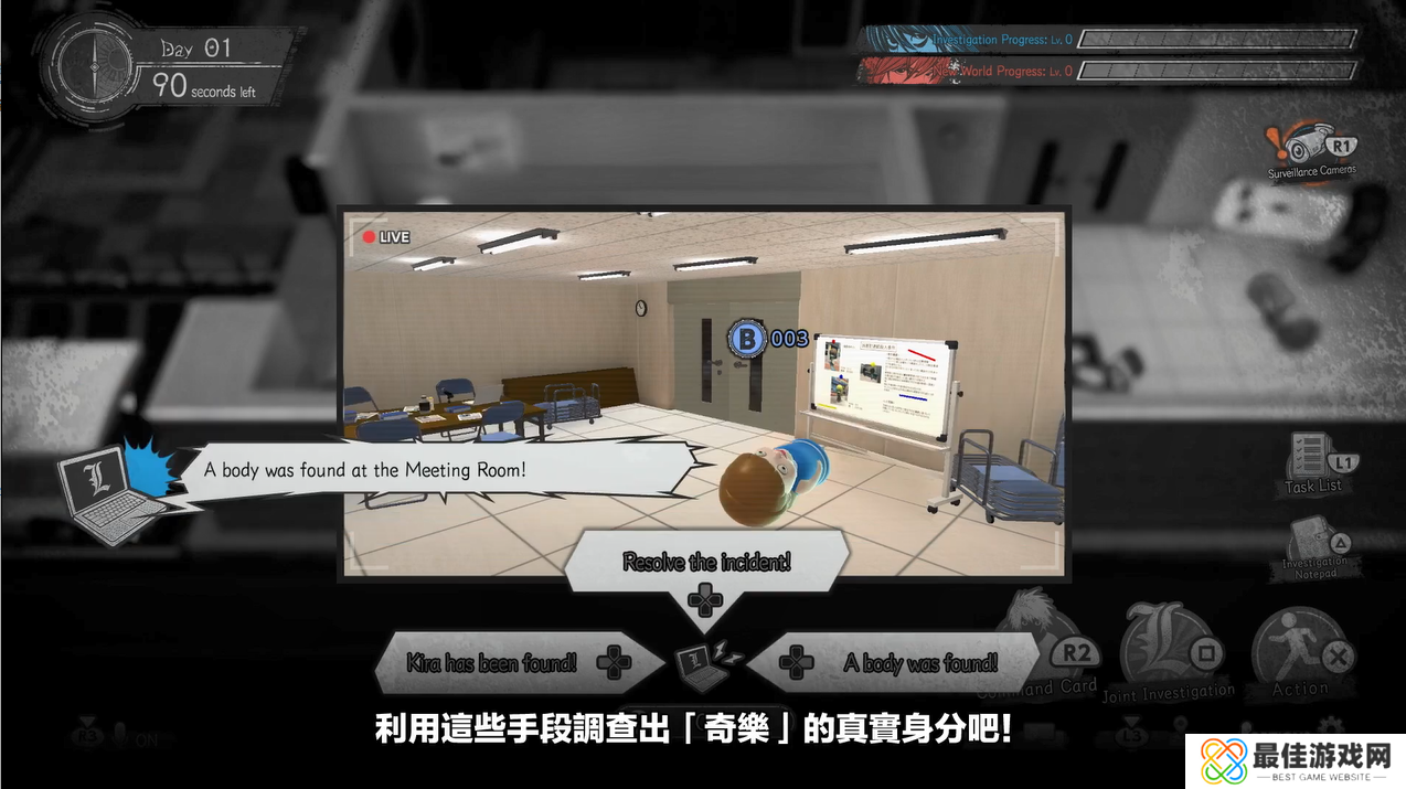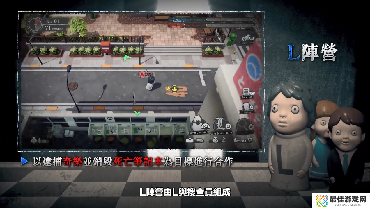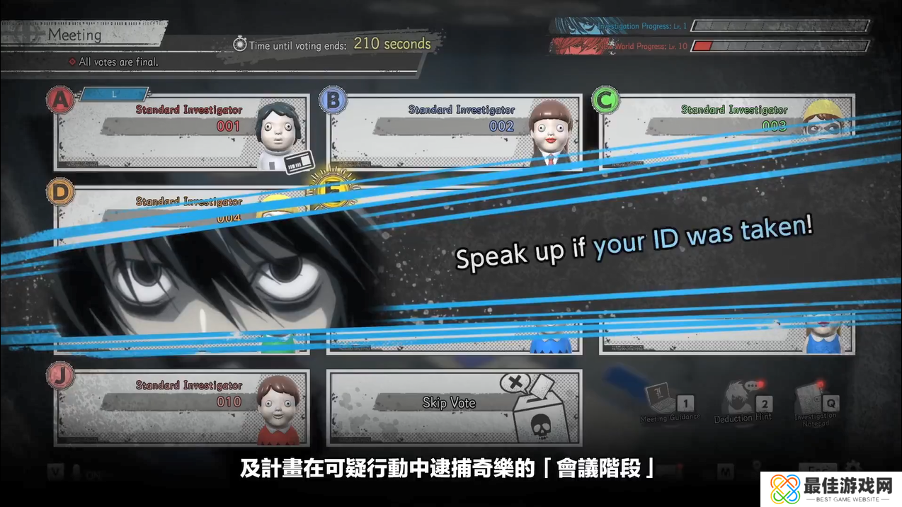 玩家将在游戏中氛围两个阵营:基拉和L,并利用自己的阵营的特殊属性来不断的试探彼此的身份,达成胜利。