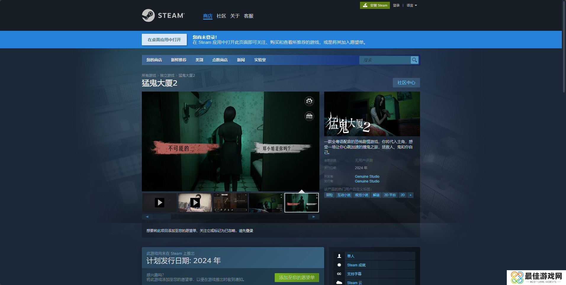 《猛鬼大厦2》是一款全粤语配音的恐怖剧情游戏,而这款游戏想要下载还是比较麻烦的,下载的第一步就是安装Steam平台,然后注册账号登录,并且搜索“猛鬼大厦2”,然后点击购买,之后点马上开玩即可。猛鬼大厦