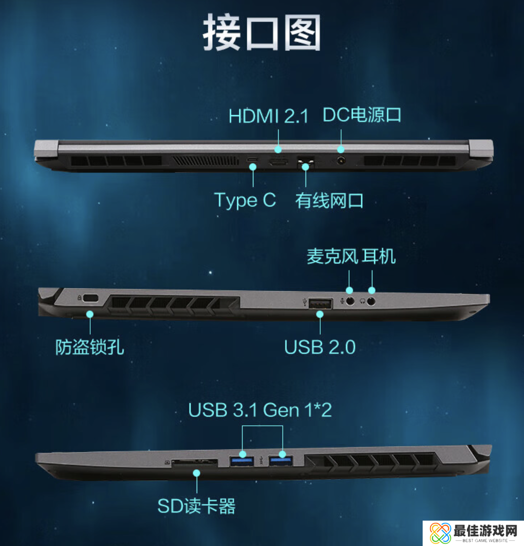 此外,该机支持Wi-Fi 6;后置1个 USB-C接口、1个 HDMI 2.1接口、1个 RJ45 接口;左置1个 USB-A 2.0接口、2个 3.5mm 音频接口;右置2个 USB-A 3.1 Gen 2接口;1个 SD卡读卡器。
