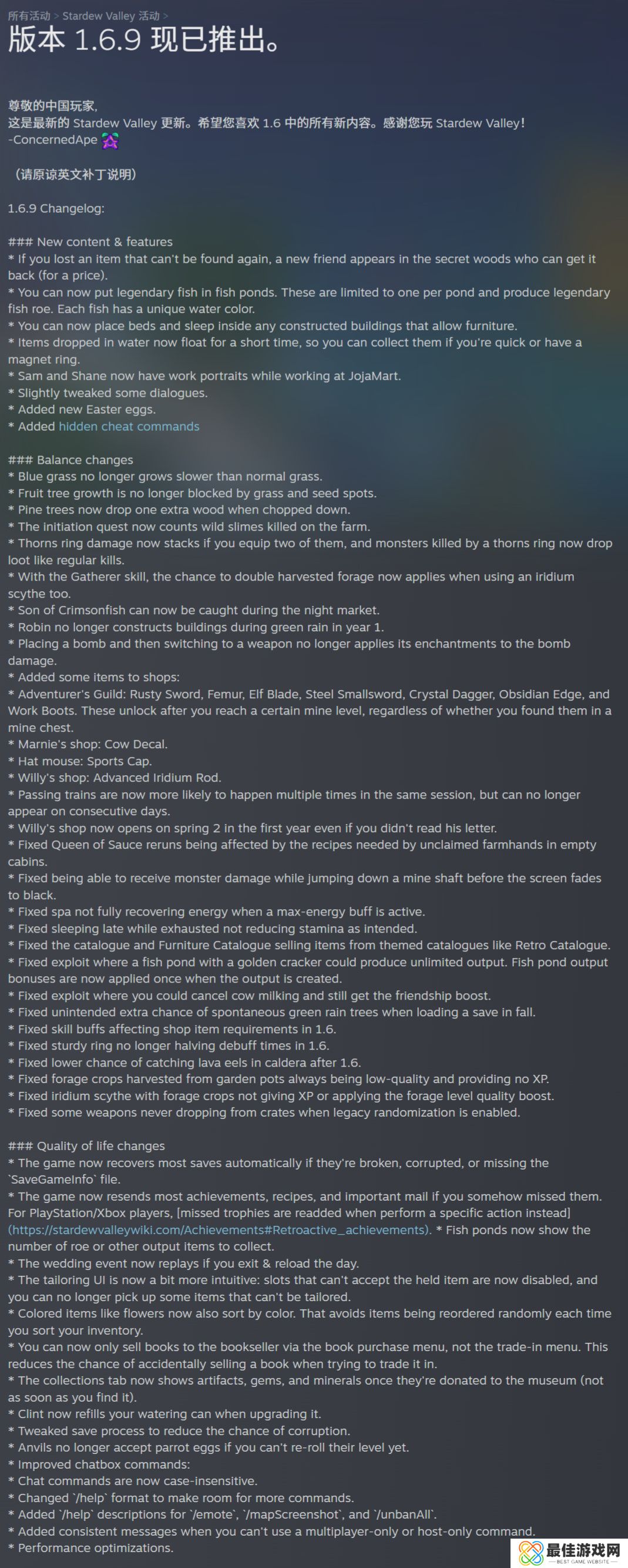 《星露谷物语》官方宣布,1.6.9版本更新已经正式上线,主机端和移动端都已更新。