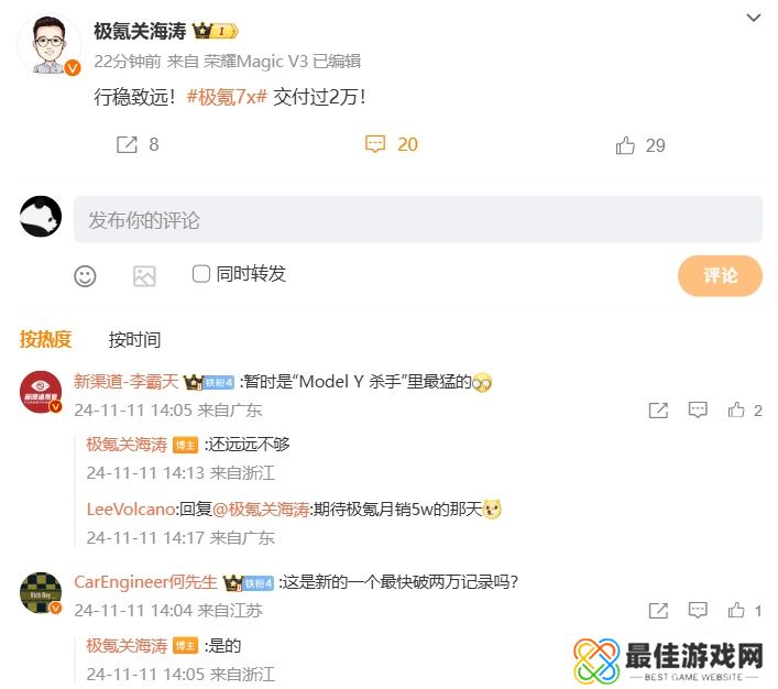 本站 11 月 11 日消息,极氪智能科技 CMO 关海涛今日发文称,极氪 7X 五座 SUV 汽车交付过 2 万。该车于今年 9 月上市,售 22 99 万元起。评论区中有网友询问“这是新的一个最快