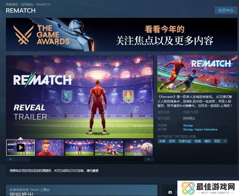 《REMATCH》是一款多人在线足球游戏。这款游戏的官网地址就是Steam平台的购买页面,进入到这个游戏的购买页面基本上就能知道所有这款游戏的信息。
