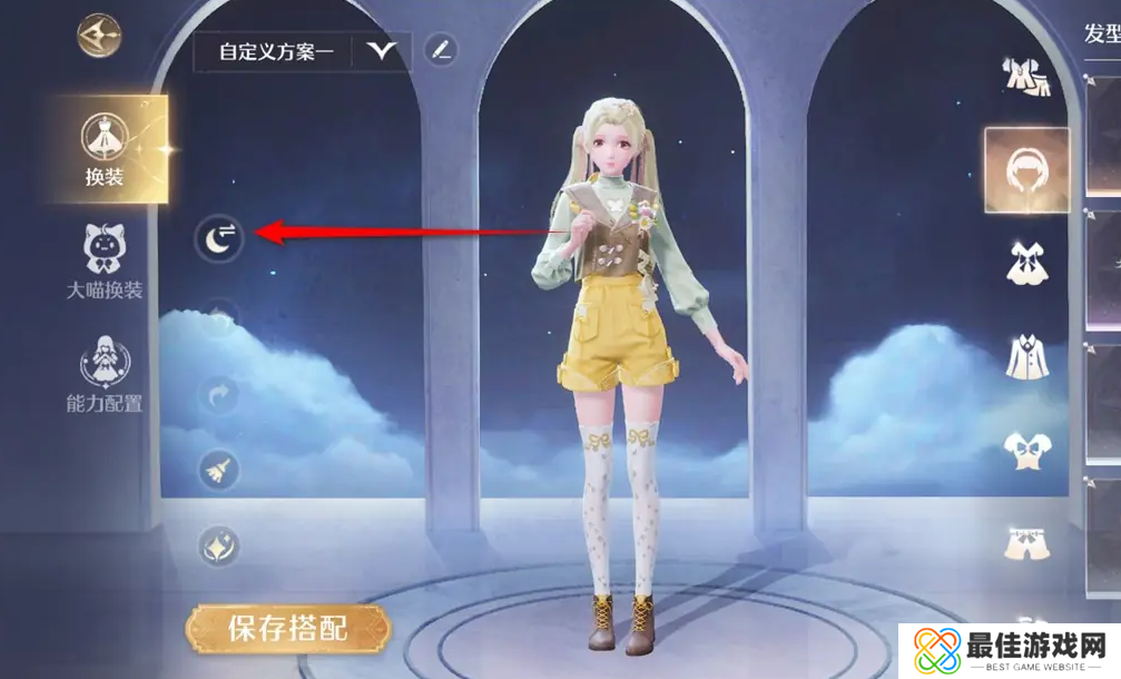 答:在试衣间内点击左侧的切换按钮,即可更换试衣间背景。