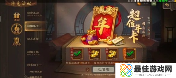 4、年卡:消费198元,满签144000元宝,充值比例1:727。