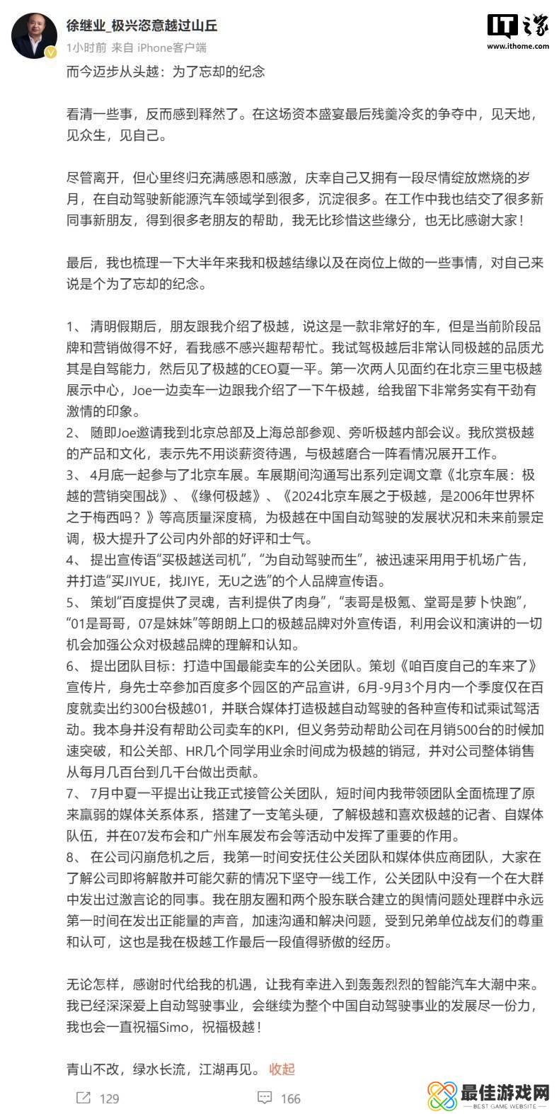 极越公关负责人徐继业离职发文:细数业绩,被指“分裂员工”后回应