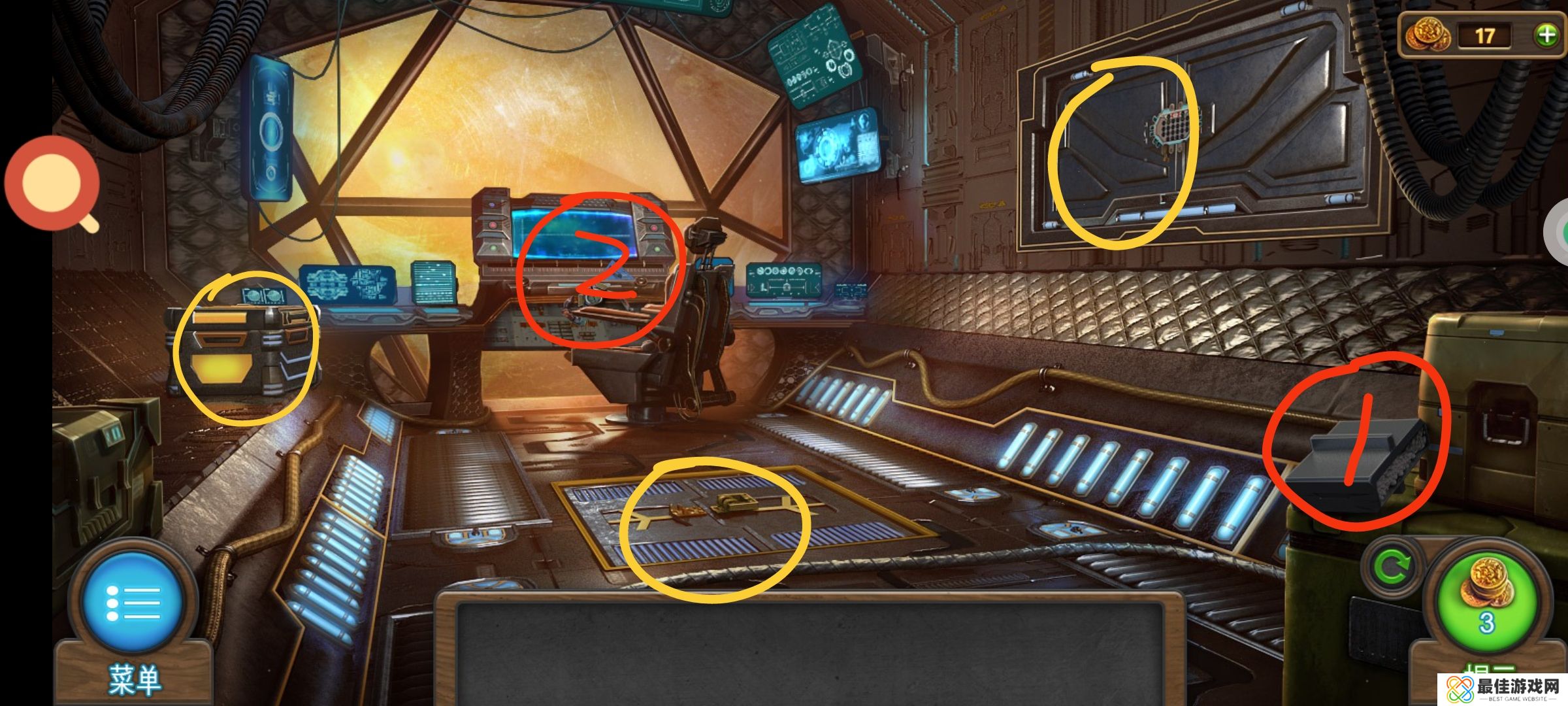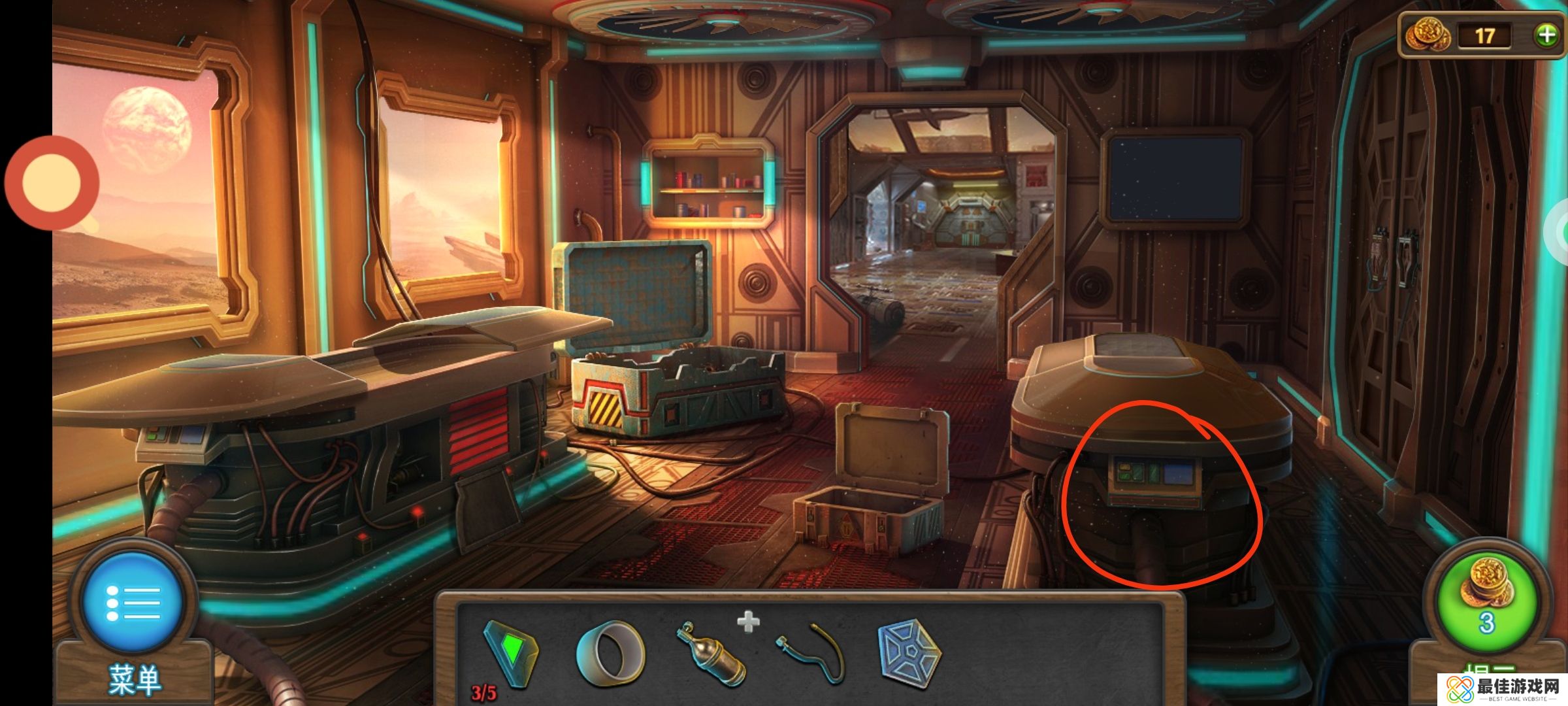 红圈处使用绿零件,完成小游戏。穿上太空服进入场景3。