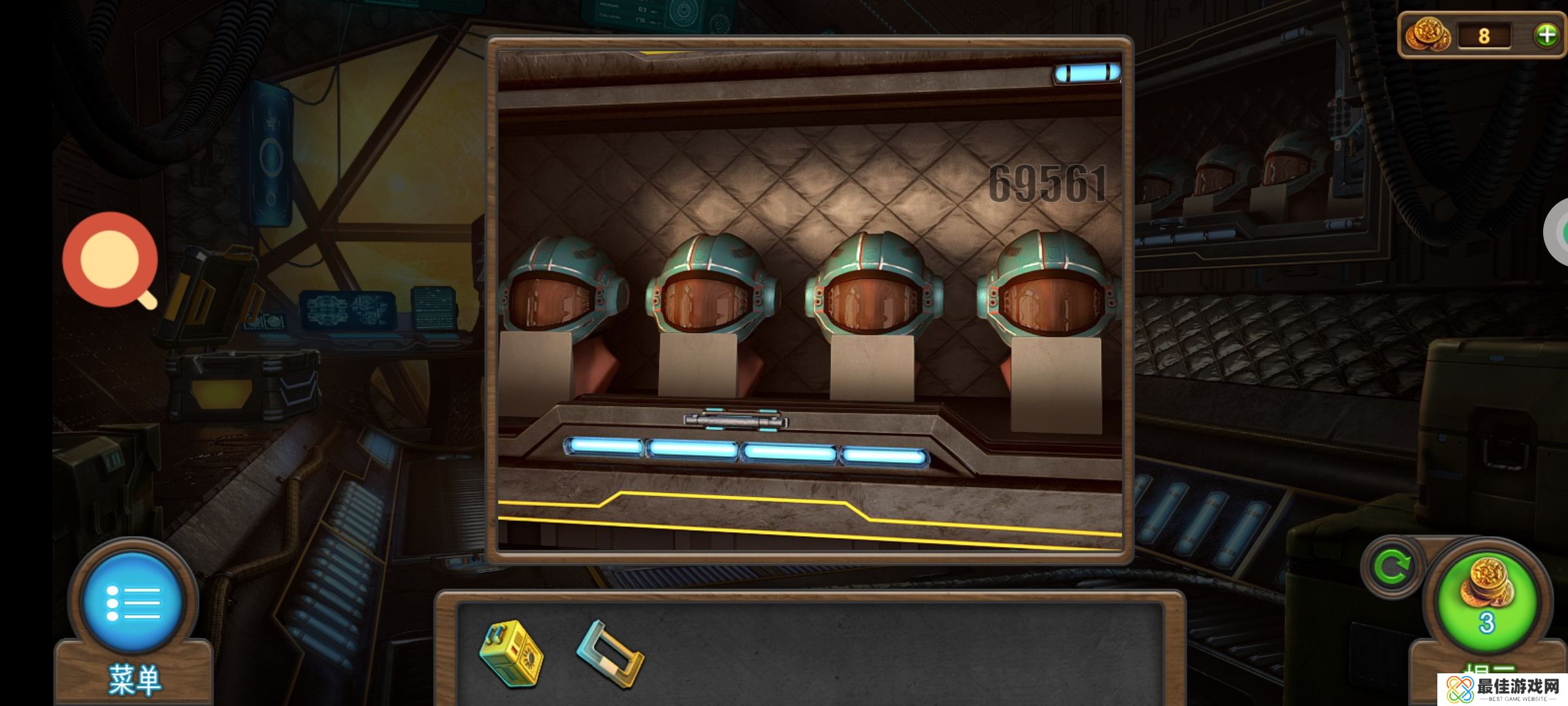 进入飞机,❶红圈1处用扫描器扫描,得到:带数据的扫描器。❷红圈2处用零件,完成小游戏,得到:把手。右上角数字69561记一下。