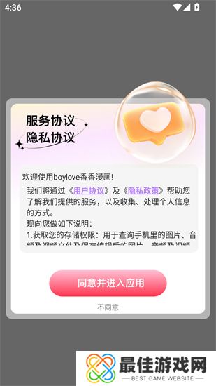 boylove漫画官方正版怎么用1、打开从本站下载的app,阅读服务协议与隐私协议,同意并进入应用。