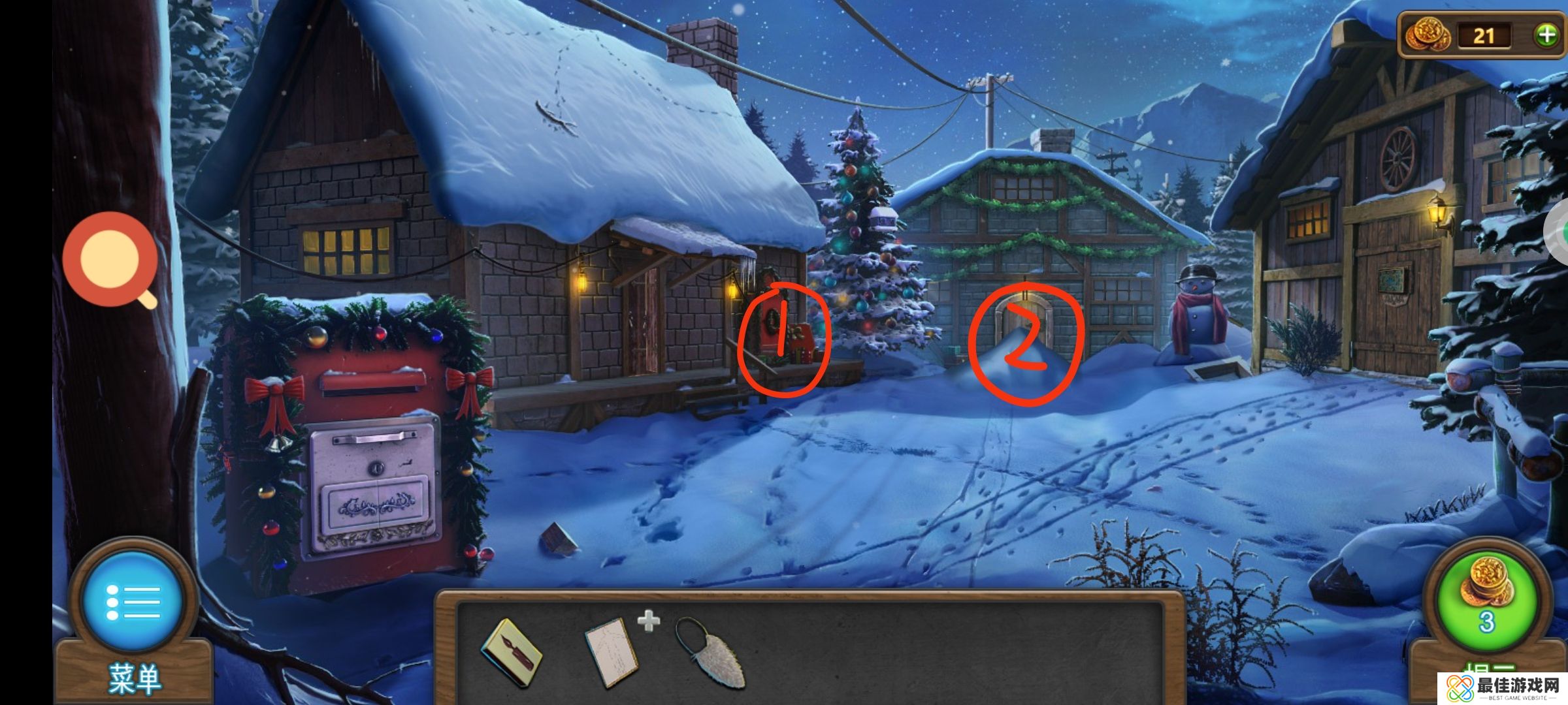 ❷红圈2处用铲子铲开雪,解锁场景:礼物房。