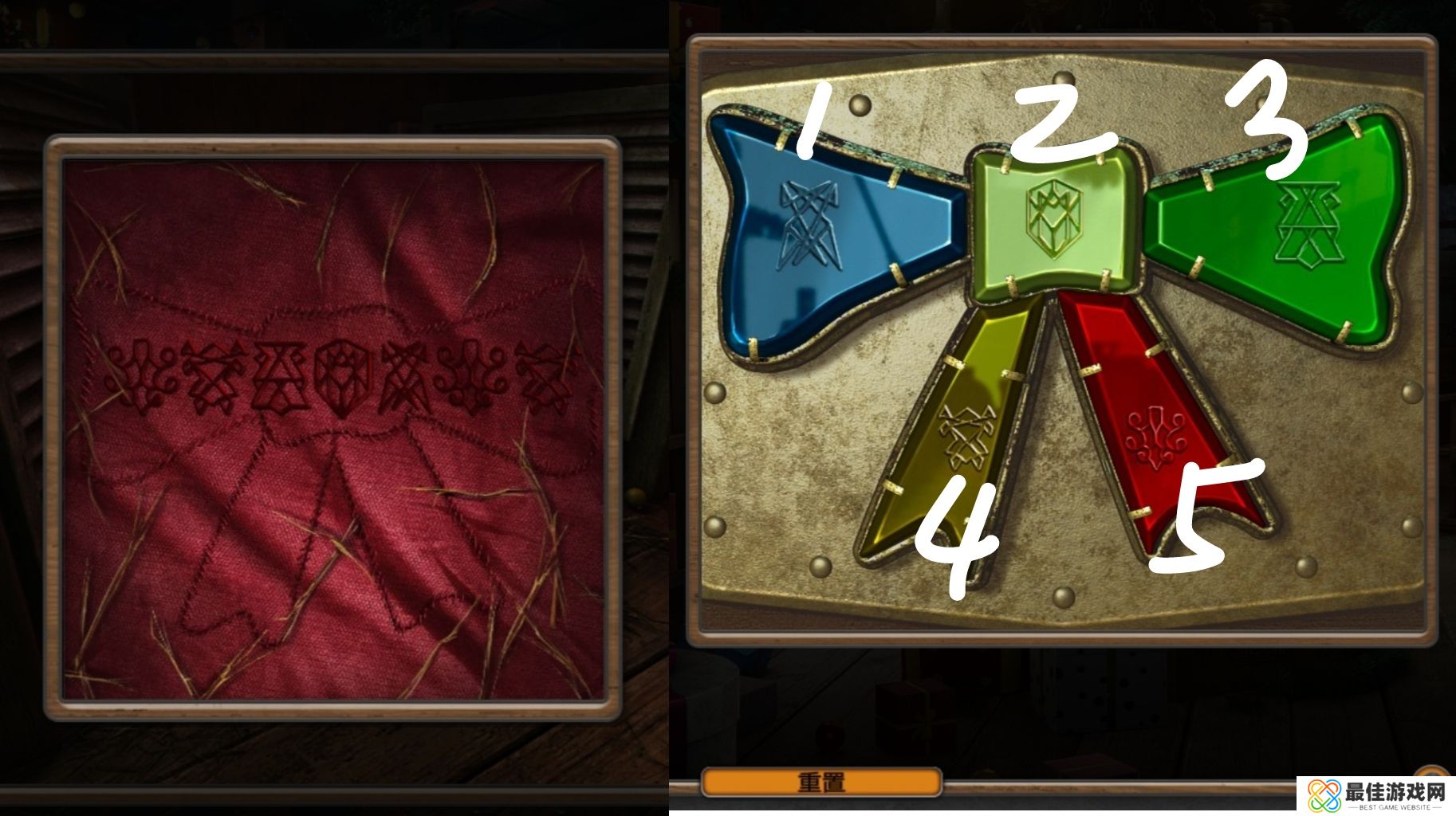 ❶白圈1处点击,根据刚刚布上的提示,按顺序点击:5432154,得到:①驯鹿小雕像2,②轮子,③毛衣。