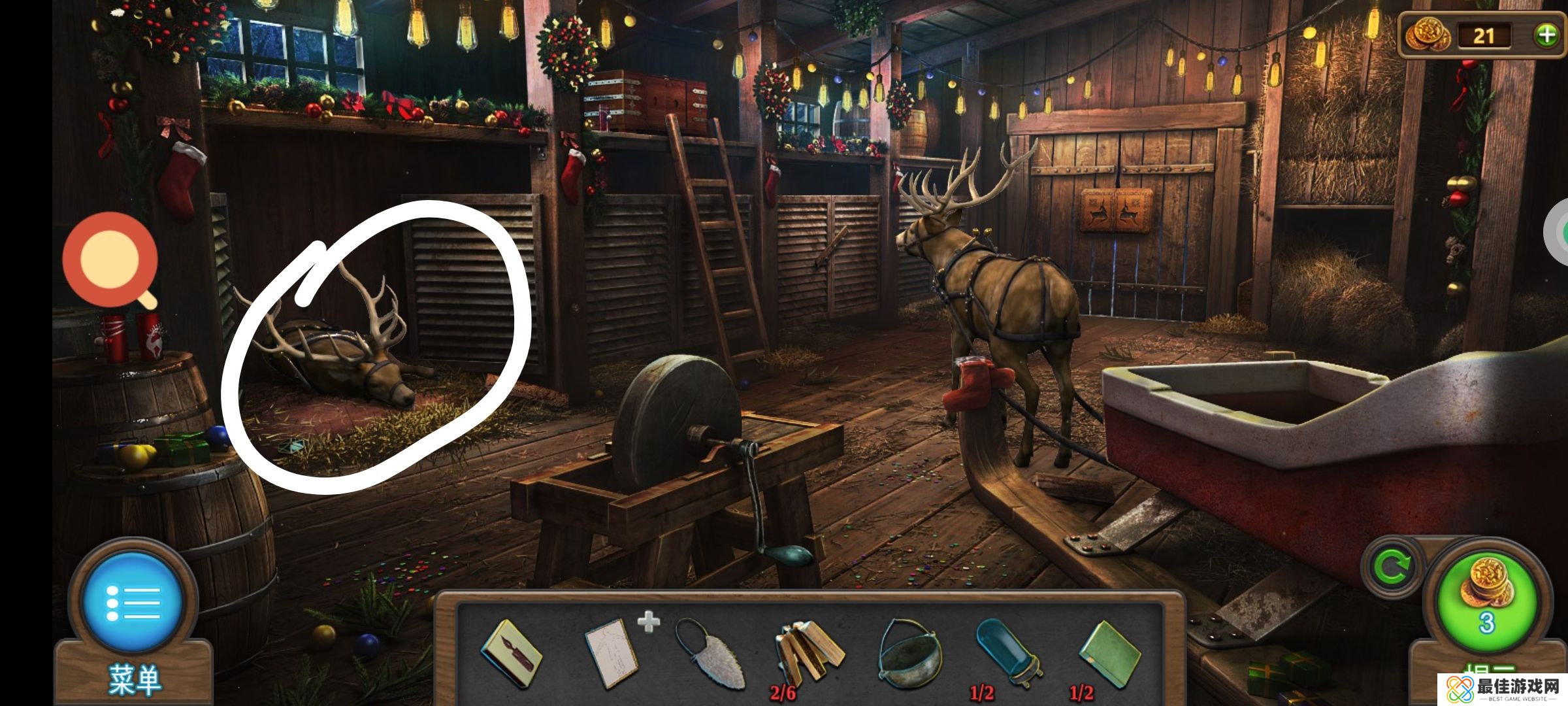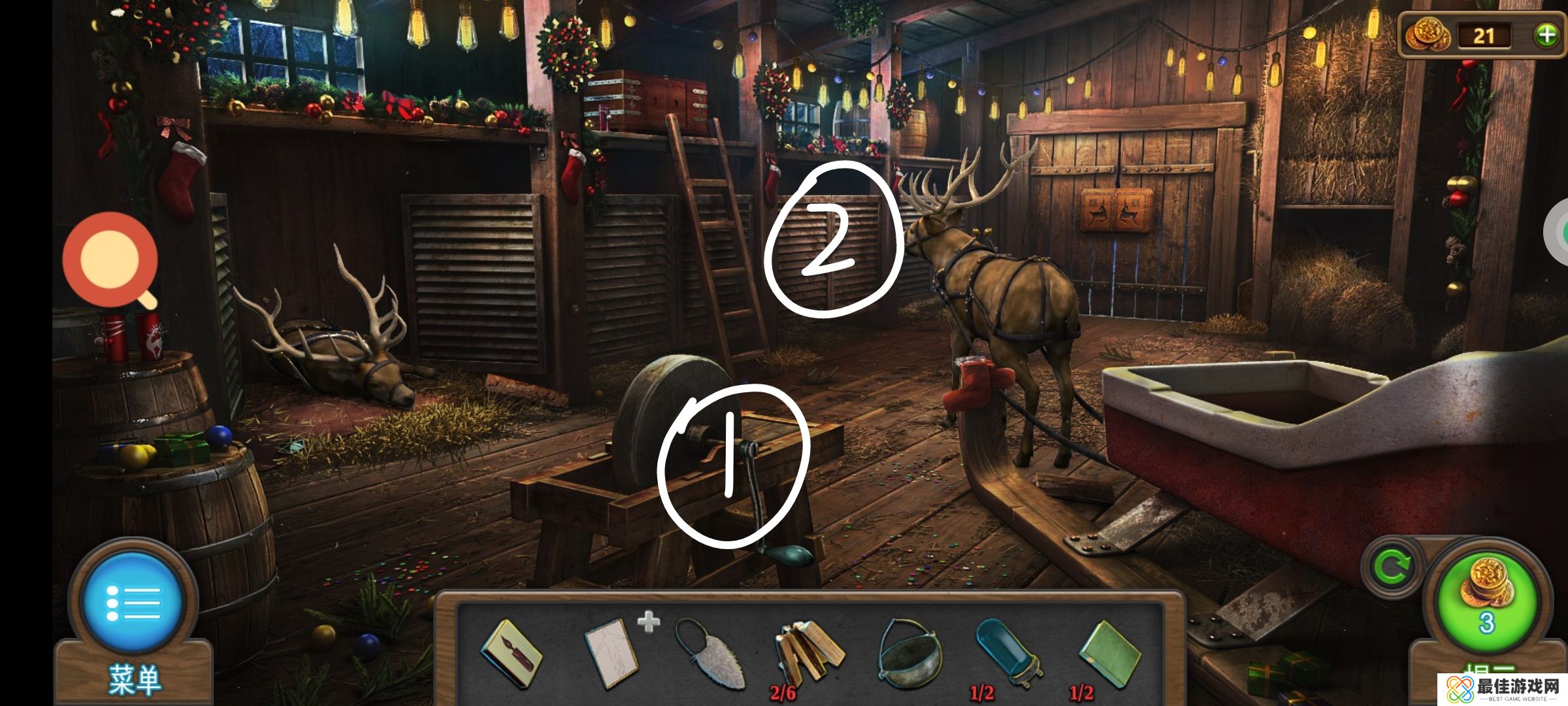 ❷白圈2处使用驯鹿小雕像,完成小游戏,通关。