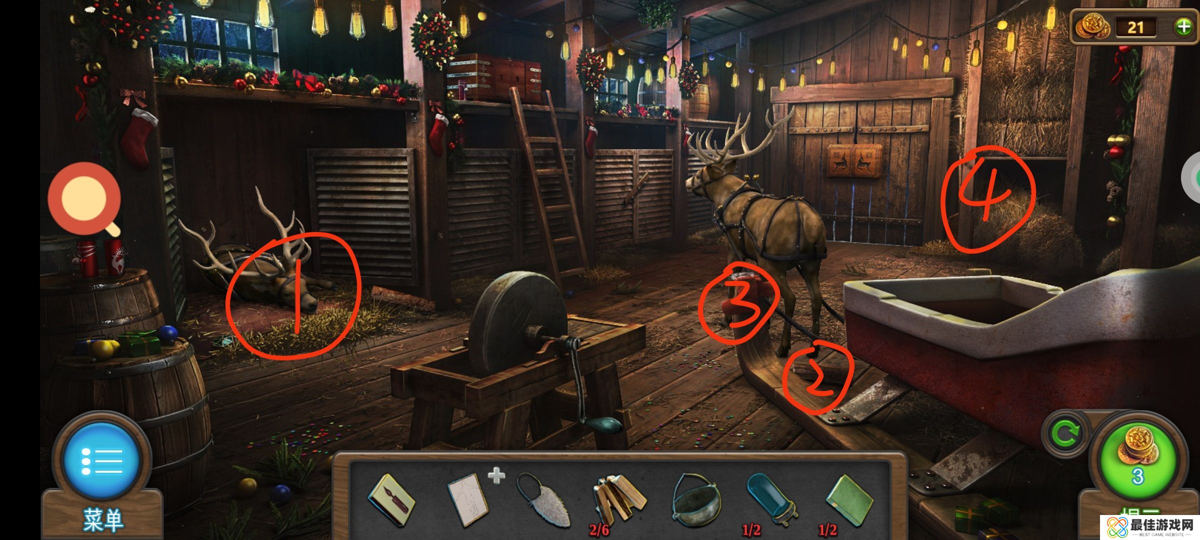 ❹红圈4处使用小雕像,完成小游戏,解锁场景驯鹿房。