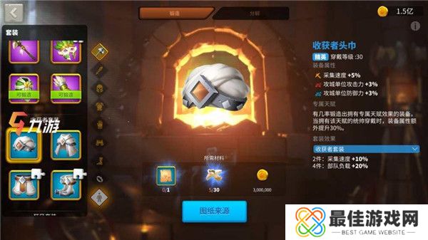 不过,我们在考虑一款套装是否值得获得的时候,装备图纸好不好获得以及相应收益都是衡量的依据。而这款收获者套装的装备图纸在获取上并没有那么轻松,还是有一定难度的,同时这款套装的收益相对来说并不是那么高,如果遇上有人前来扫田的话,我们采集武将是很难和对方精锐部队硬碰硬的。